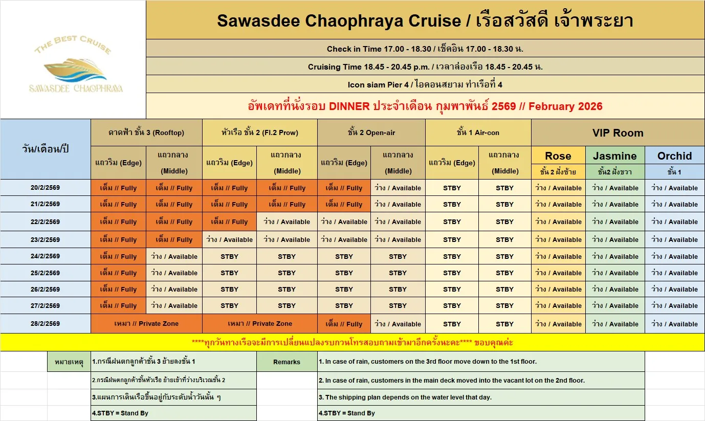 Book Sawasdee Chaophraya dinner cruise tickets with RestNFun. and choose your seating zone on the Chao Phraya River dinner cruise (All zones and seats are the same price.)